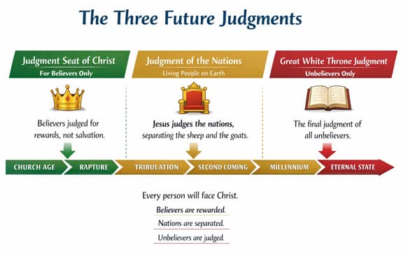 Ask God: Don’t take a trip through life without God’s roadmap, the Bible. Adhering to the Word will prevent you from getting lost and wandering through life. We all need direction for our lives and the Word of God provides that direction. Good Evening Reader, We have so much to be thankful for. God is with us wherever we go or whatever we do. May we strive to please Him in all we do. God Bless. Elvin Understanding the Three Judgment Seats Understanding the three judgment seats is important for all people, especially believers. If you were to get in your vehicle for a trip without knowing where you were going or why, the results probably would not be to your liking. The Word of God is your road map and your guide. It enlightens believers about what is needed for the trip and what to expect upon arrival. If you know that judgments are coming based on the demonstration of your faith, you may want to adjust your attitude and come into alignment with God’s Word. The Bible tells us what we need to do to be saved and what our rewards are based on. The three judgment seats are: 1) The Judgment Seat of Christ, 2) The Judgment of the Nations, and 3) The Great White Throne Judgment. We will discuss what they are, when they will occur, and who is judged. Judgment Seat of Christ First, the Judgment Seat of Christ is a future event in which believers in Jesus Christ will stand before Him to have their lives evaluated. This is not a judgment to determine salvation. That issue was settled the moment a person placed their faith in Christ. Instead, this judgment concerns rewards, responsibility, and faithfulness in a believer’s life. The key passage is 2 Corinthians 5:10, which says, “For we must all appear before the judgment seat of Christ, that each one may receive the things done in the body, according to what he has done, whether good or bad.” The word “bad” here carries the idea of what is worthless, not sinful condemnation. Another important reference is 1 Corinthians 3:12–15: “Anyone who builds on that foundation may use a variety of materials—gold, silver, jewels, wood, hay, or straw. But on the judgment day, fire will reveal what kind of work each builder has done. The fire will show if a person’s work has any value. If the work survives, that builder will receive a reward. But if the work is burned up, the builder will suffer great loss. The builder will be saved, but like someone barely escaping through a wall of flames.” Paul explains that a believer’s works will be tested by fire. Works done for Christ with the right motives will remain and be rewarded. Works done for self or without eternal value will be burned up, though the person is still saved. This judgment will take place after the rapture of the church. It is a time of accountability, not punishment. It is important to remember that God desires believers to live with purpose. Every act of obedience, every sacrifice, and every faithful decision matters. This judgment motivates believers to live intentionally, knowing their lives have eternal significance. Another way to say this: Salvation is a gift, but rewards are earned through faithfulness. Judgment of the Nations aka The Sheep and Goats Judgment Second, the Judgment of the Nations is described by Jesus in Matthew 25:31–46. It takes place when Christ returns to earth in His glory and sits on His throne to judge the nations. This judgment occurs after the second coming of Christ and during the Millennium. This judgment is different from the Judgment Seat of Christ. Here, Jesus judges living people who have survived the Tribulation. He separates them as a shepherd separates sheep from goats. The sheep represent those who demonstrated genuine faith by how they treated “the least of these,” often understood as Christ’s brethren, likely referring to Israel or believers during that time. The goats represent those who showed no such evidence of faith. The basis of this judgment is not merely acts of kindness, but what those acts reveal. Their actions are evidence of their heart condition. True faith expresses itself through compassion and obedience and is the manifestation of a person’s faith. Verse 34 says the sheep inherit the kingdom prepared for them. It says, “Then the King will say to those on his right, ‘Come, you who are blessed by my Father, inherit the Kingdom prepared for you from the creation of the world.” Verse 46 says the goats go away into everlasting punishment. It says, “And they will go away into eternal punishment, but the righteous will go into eternal life.” Understanding the “why” is critical to understand this judgment. This judgment shows that faith is not just words. It is revealed through actions. It also demonstrates that Jesus is King over all nations and holds all people accountable. In essence, this judgment reveals who truly belongs to Christ based on the evidence of their lives. Great White Throne Judgment—The Final Judgment of the Unbelievers And finally, the Great White Throne Judgment is the final and most solemn judgment described in Scripture. It is found in Revelation 20:11–15. This event takes place after the Millennium, when heaven and earth as we know them have passed away. Revelation 20:11-15 says, “And I saw a great white throne and the one sitting on it. The earth and sky fled from his presence, but they found no place to hide. I saw the dead, both great and small, standing before God’s throne. And the books were opened, including the Book of Life. And the dead were judged according to what they had done, as recorded in the books. The sea gave up its dead, and death and the gravegave up their dead. And all were judged according to their deeds. Then death and the grave were thrown into the lake of fire. This lake of fire is the second death. And anyone whose name was not found recorded in the Book of Life was thrown into the lake of fire.” John describes a great white throne and Him 
